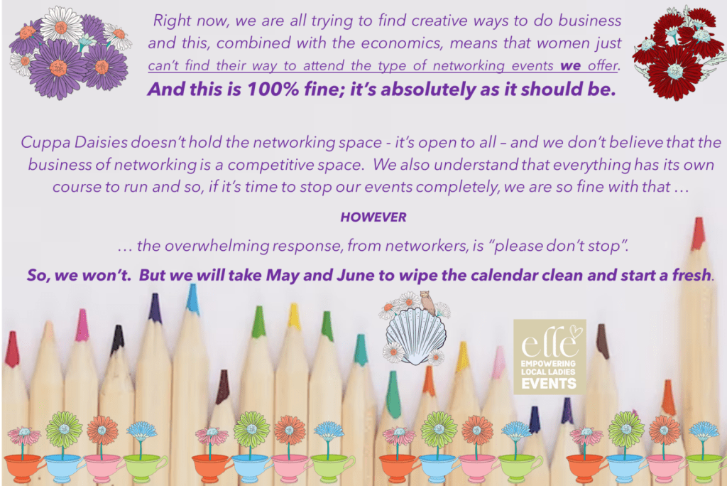 After a successful run of networking events in 2021 and 2022, including breaking out into new areas, Cuppa Daisies started 2023 with great enthusiasm, and a calendar full of event dates. We were so confident that we provided Bulk-Packages for networkers and had a growth pipeline of 4 to 5 new areas.